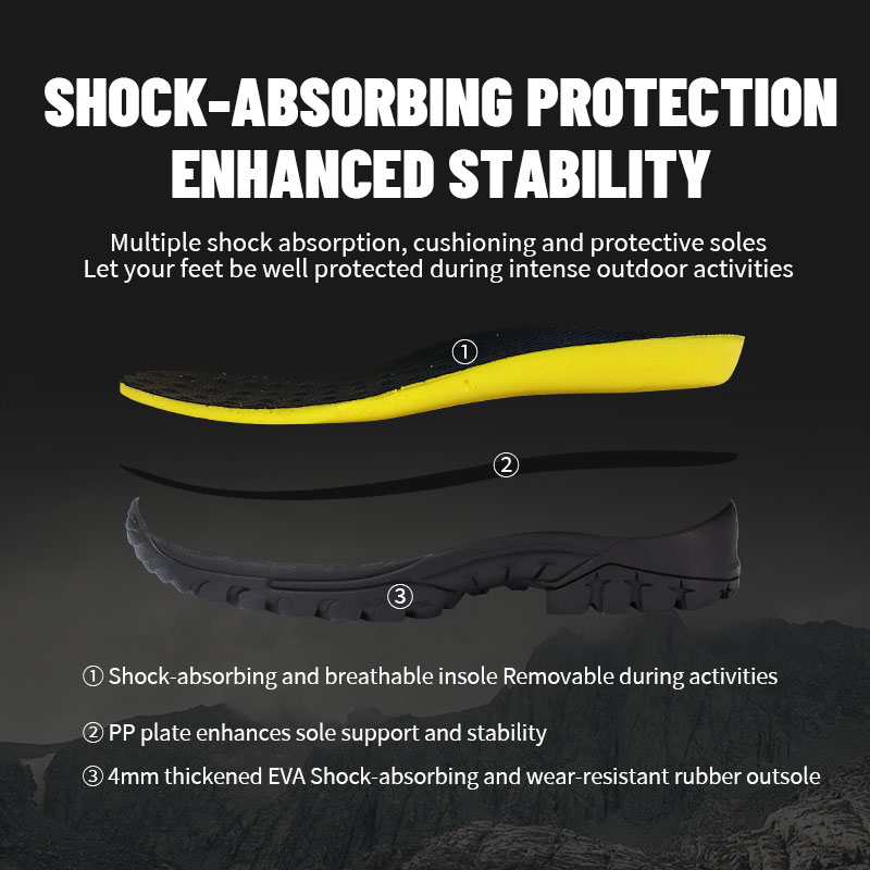 ①Insole empuk lan ambegan—bisa dicopot nalika sampeyan kudu ngresiki utawa ngganti. ②Dikuatake karo piring PP kanggo dhukungan ekstra ing sikil-dadi saben langkah krasa padhet lan dikontrol. ③4mm EVA kandel nyerep kejut lan outsole karet sing tahan nyandhang.