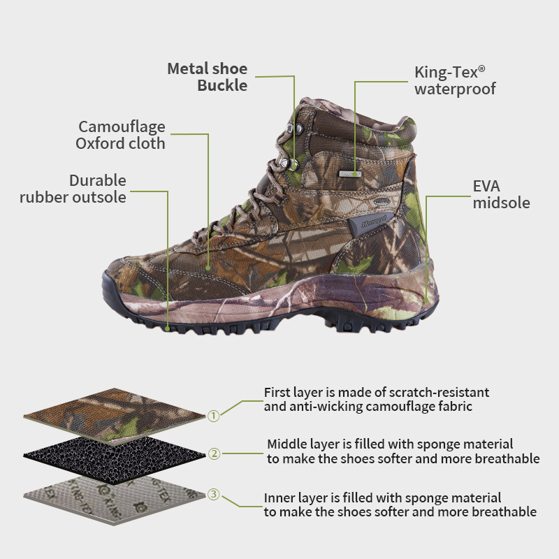 ①Lapisan pisanan digawe saka kain kamuflase sing tahan gores lan anti-wicking. ②Lapisan tengah diisi bahan spons kanggo nggawe sepatu luwih alus lan ambegan. ③Lapisan njero diisi bahan spons kanggo nggawe sepatu luwih alus lan ambegan.