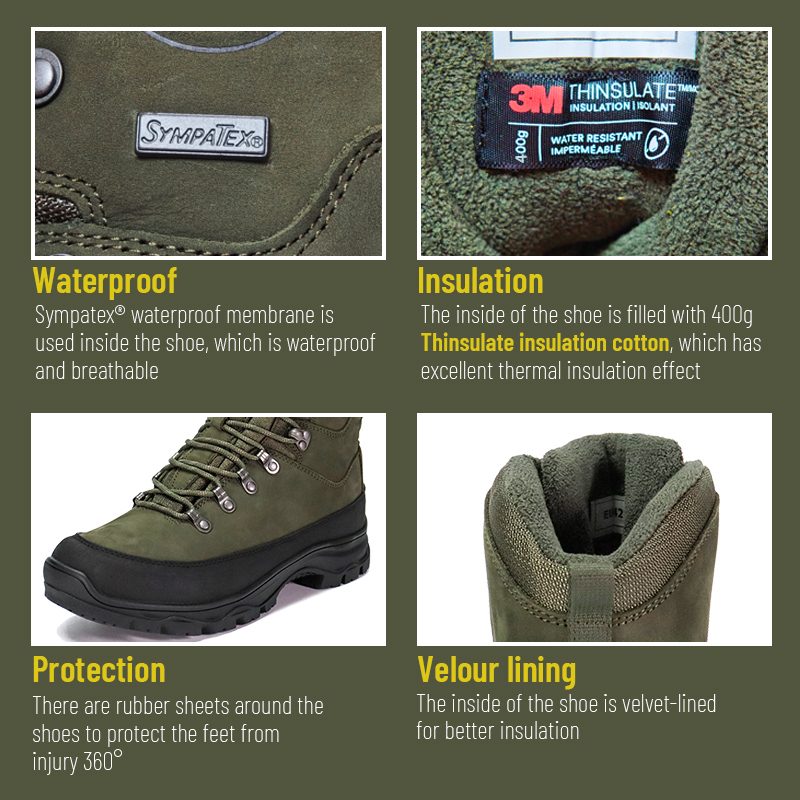 Iki Sympatex Waterproof Insulation Thinsulate Hunting Boots kasedhiya kanggo kustomisasi ing werna, bahan, lan rincian, karo MOQ saka 800 pasang, becik kanggo kolaborasi merek lan pengadaan klompok. Lan boots mburu iki duwe kaluwihan ing ngisor iki: